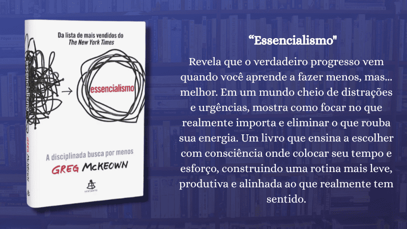 O livro Essencialismo mostra como dizer não ao que só ocupa tempo e focar no que realmente traz resultado. É uma leitura que ajuda a simplificar a rotina, ganhar clareza e trabalhar com mais foco e propósito no que realmente importa.