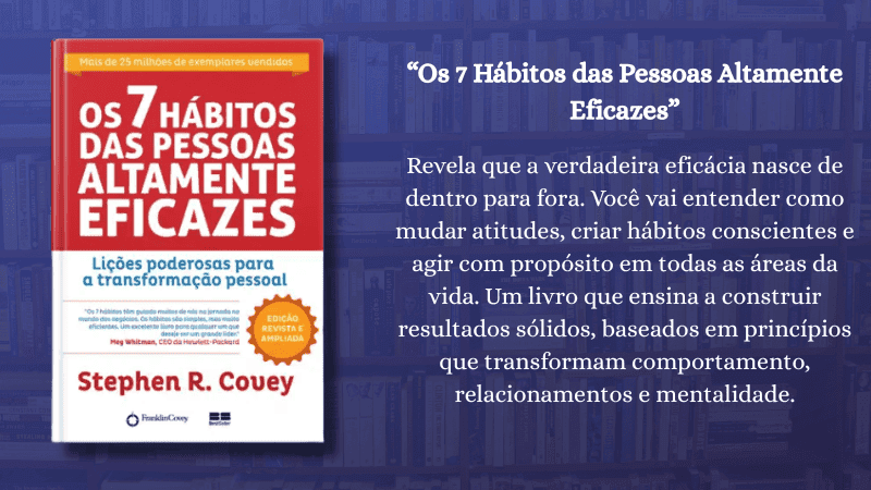 Ler Os 7 Hábitos das Pessoas Altamente Eficazes é entender que sucesso não tem a ver com sorte, e sim com atitudes que você repete todos os dias. O livro mostra como mudar seus hábitos, melhorar seus relacionamentos e assumir o controle da própria vida. É uma leitura que ensina a crescer com equilíbrio, foco e responsabilidade — dentro e fora do trabalho.