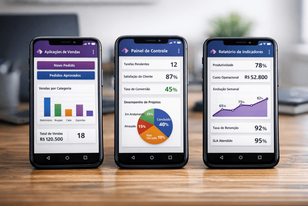Imagine que você precisa de um aplicativo para sua equipe de vendas registrar visitas aos clientes, tirar fotos dos produtos expostos e enviar relatórios automáticos. Com Power Apps você cria isso em algumas horas, não em meses. O aplicativo funciona no celular, no tablet e no computador. Todos os dados ficam centralizados e acessíveis em tempo real.